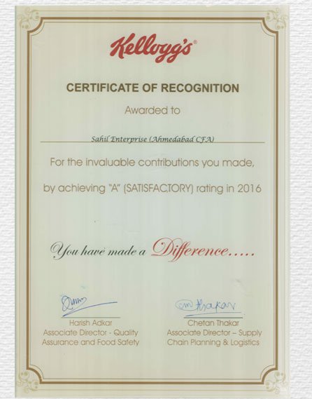 Kelloggs : Certificate of Recognition for FY 2016-17